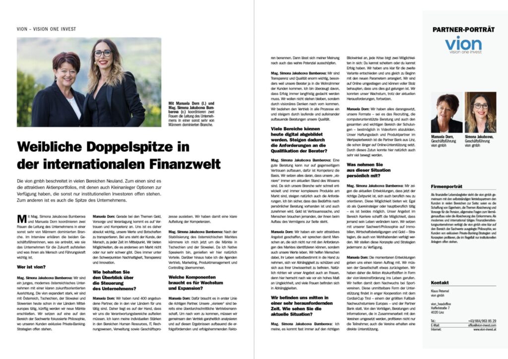 Mag. Simona Jakubcova Bumberova: Eine gute Beratung kann nur auf gegenseitigem Vertrauen aufbauen, dafür ist Kompetenz die Basis. Wir setzen alles daran, dass unsere „vioniere“ immer am aktuellen Stand des Wissens sind. Da sich unsere Branche sehr schnell entwickelt und immer komplexere Produkte am Markt sind, steigen natürlich auch die Anforderungen. Ich bin sicher, dass das Bedürfnis nach persönlicher Beratung vorhanden ist und auch zunehmen wird. Geld ist Vertrauenssache, und Menschen brauchen jemanden, der ihnen beim